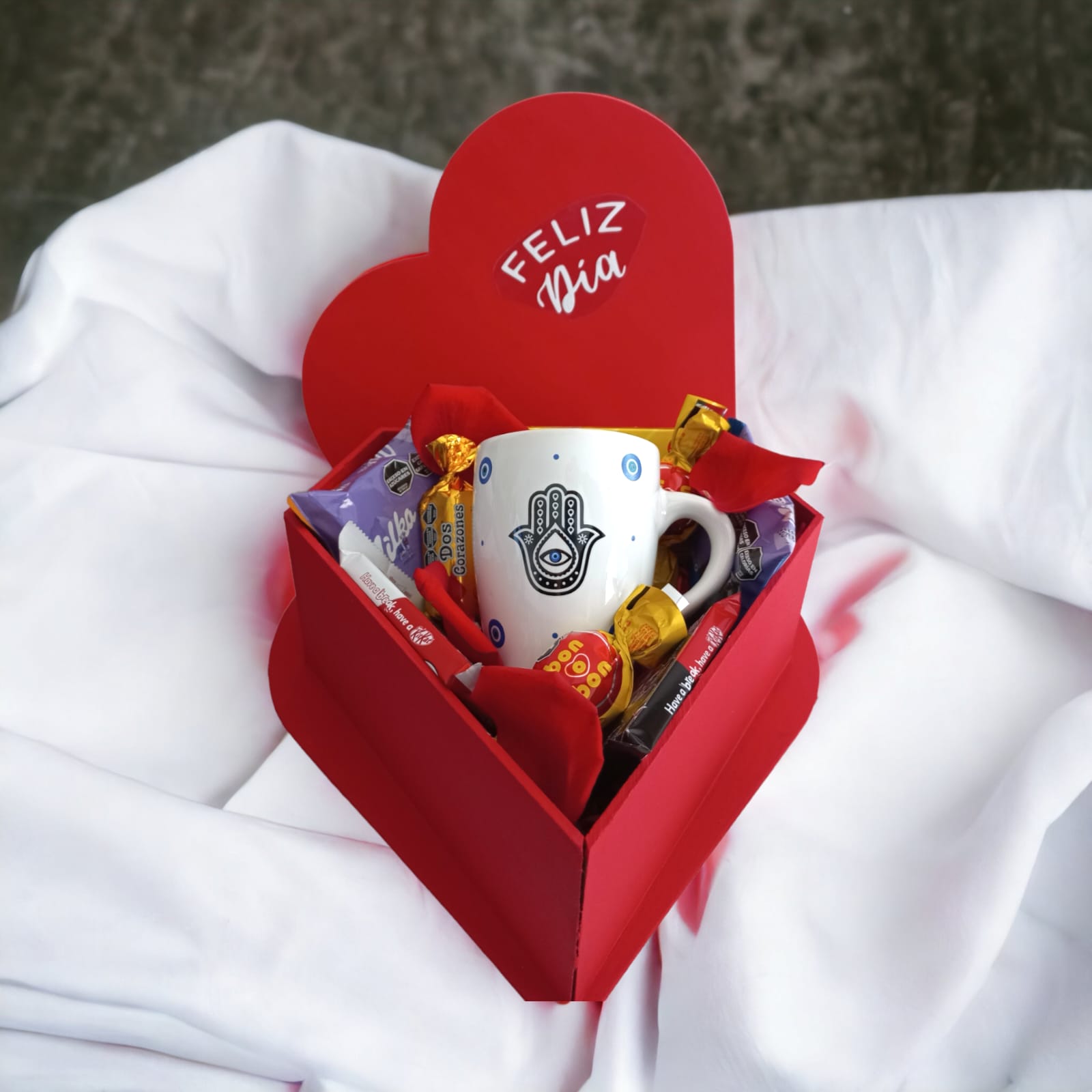 Caja Namasté Descripcion Una taza de ceramica Dos alfajores Milka Tiple, de Dulce de Leche y Oreo. Un ferrero