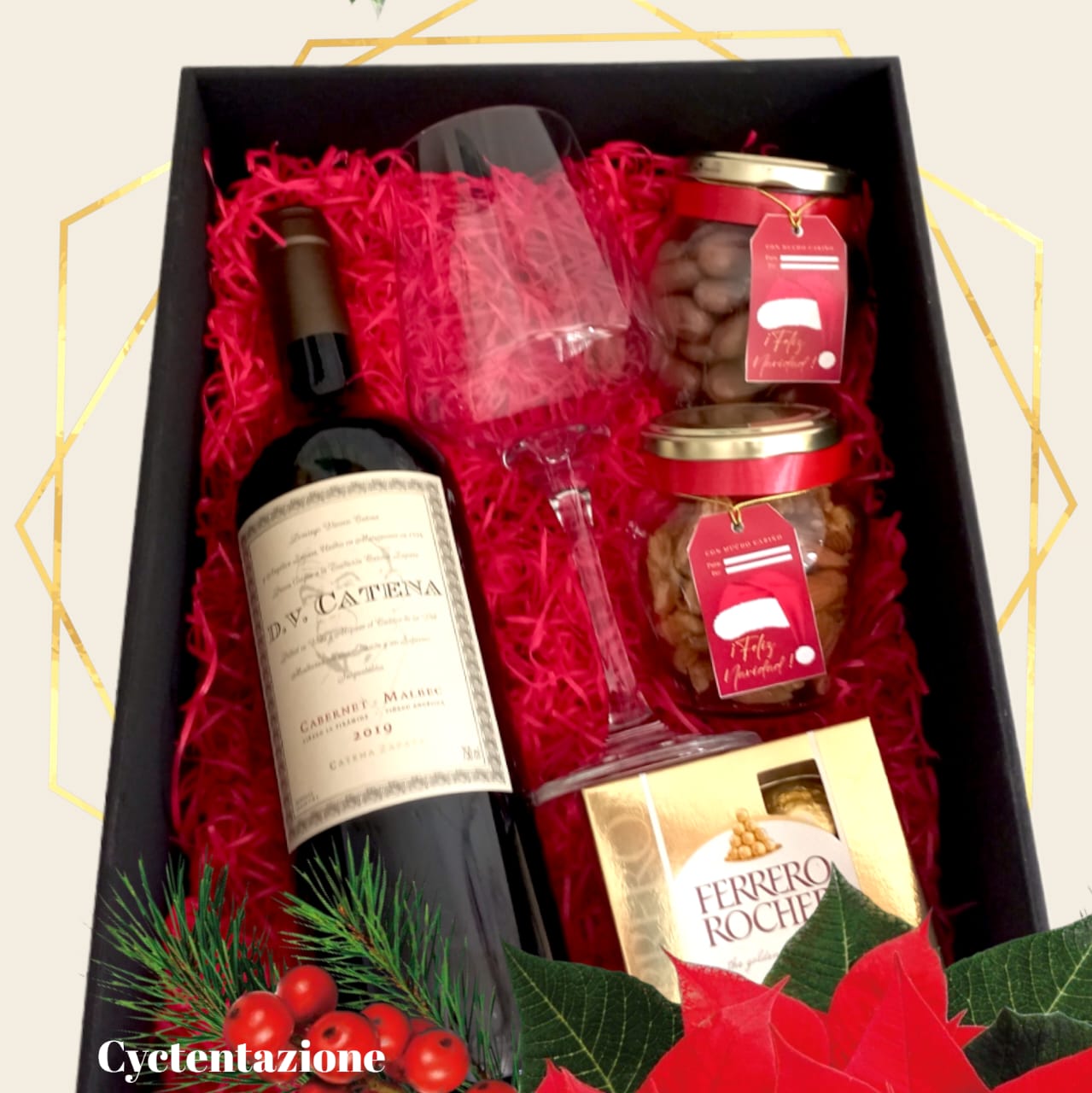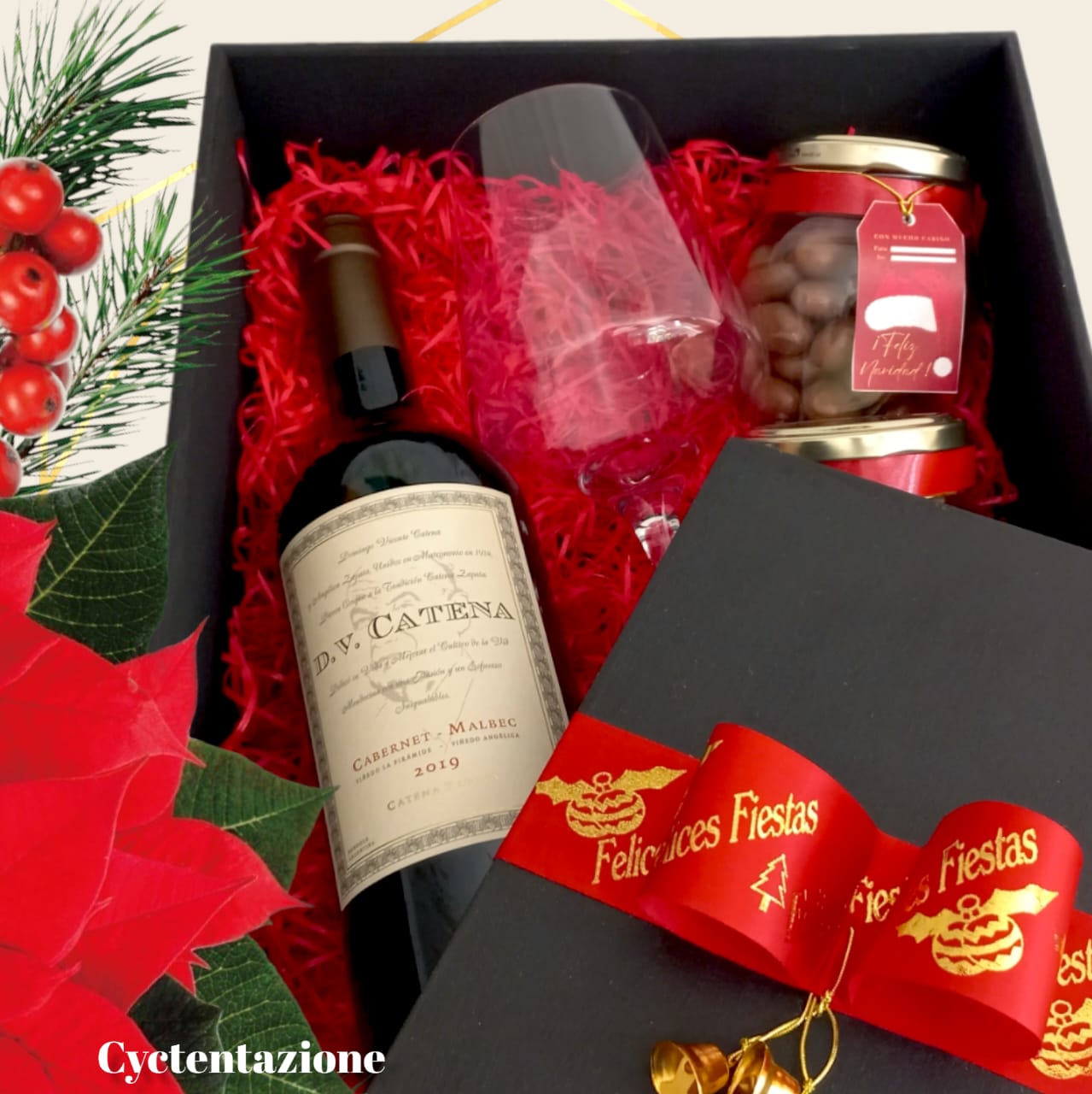 - EN UNA CAJA DE CYC TENTAZIONE CON DECORACIONES EN CINTAS Y VINILOS PARA LAS FIESTAS.